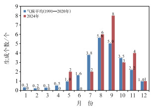 图 2 气候平均与2024年的逐月台风生成个数 Fig. 2 Monthly averaged numbers of typhoons generated in 2024 and the climatological mean |