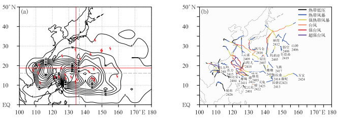 图 3 西北太平洋和南海(a)1949—2023年台风生成源地密度分布(等值线)和(b)2024年台风路径 注:图a为每4°×4°空间范围内台风生成个数,台风符号为2024年台风生成位置,红色实线和灰色虚线垂直相交位置分别为2024年平均和多年平均(1949—2023年)的台风生成位置。 Fig. 3 (a) Density distribution (contour) of typhoon generation areas in 1949-2023 and (b) tracks of typhoons generated in 2024 over the Northwest Pacific and South China Sea |