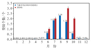 图 6 气候平均与2024年的逐月台风登陆个数 Fig. 6 Monthly averaged numbers of typhoons making landfall in China in 2024 and in the climatological mean |