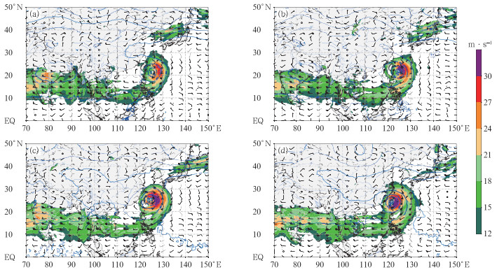(2) 数值模式预报“格美”登陆后期折向偏北方向移动,因而出现较大误差,但并不是对环流形势场的预报出现较大偏差,主要是对“格美”登陆后的结构难以把握。因此业务预报的难点在于参考模式预报并进一步关注地形对弱台风或者残涡移动及结构变化的影响。