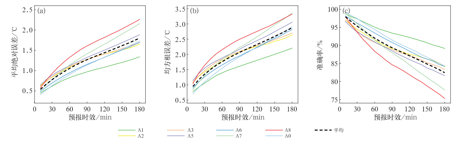 图 3 2023年8个交通气象站模型预报能力评估(a)平均绝对误差,(b)均方根误差,(c)准确率 Fig. 3 Evaluation of forecasting perfomance of eight traffic meteorological station models in 2023 (a) mean absolute error, (b) root mean square error, (c) accuracy |