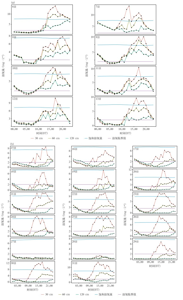 2024年8月15—31日池塘2分层溶氧量变化整体特征与池塘1类似,略有不同的是研究时段后期(27—28日)出现降温寡照天气,因此水体溶氧量呈现出阶段性变化(图 2b)。15—26日为持续晴热高温天气,水体溶氧量相对较高。其日变化具体为20:00至次日08:00各层溶氧量逐渐下降、数值较为接近,溶氧量在0.3~5.5 mg·L-1;上午随着太阳辐射增加及池塘光合造氧活跃,各层溶氧量开始明显增加的时间随深度增加而递次推后,其中上层溶氧量最丰富,14:00—18:00达到峰值(6.1~13.5 mg· L-1);此后各层溶氧量逐渐下降且最终数值接近。27—28日出现降温(降温幅度达8℃),日照时数大幅下降,各层间溶氧量差异较小并维持在2 mg·L-1以下。29日后气温及太阳辐射回升,池塘上层溶氧量峰值升至7~14 mg·L-1。在自然状况下(池塘2无增氧措施)02:00—07:00各层溶氧量低于2 mg·L-1,下层溶氧全天多数时段低于2 mg· L-1,为低溶氧环境。Deborah(1996)认为溶氧量低于2 mg·L-1将会导致大多数鱼类的死亡,池塘2主养品种乌鳢虽为耐低氧型经济鱼类,但持续低溶氧会影响其生长和摄食。