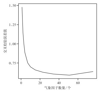 预测模型中气象影响因子最优数量由randomForest程序包中rfcv函数确定,采用十折交叉验证误差曲线取舍气象因子,通过训练集交叉验证5次得到气象因子数量与误差拟合曲线(图 3),发现40~ 60个气象因子拟合效果最优,按重要性排序选择前50个气象因子进行RF-SVR池塘溶氧量建模。