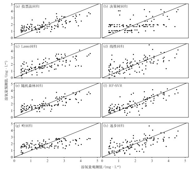从各模型测试集数据验证结果来看(图 5),决策树回归、岭回归模型数据点沿y=x直线呈现非对称分布,表明模型预测值与实际值误差较大,决策树回归模型数据分布较分散且无明显规律,岭回归模型对于溶氧量3 mg·L-1以上样本模拟值偏低,对溶氧量1.5 mg·L-1以下样本模拟值偏高。投票法回归、随机森林回归等其余6种模型数据点均均匀分布在y=x直线两侧,但线性回归模型数据点较分散,投票法回归、Lasso回归、随机森林回归、逐步回归、RF-SVR等5种模型数据点沿y=x直线收敛,表明模型预测精度较高,但大部分模型对3.5 mg·L-1以上溶氧预测值偏小,相比之下RF-SVR预测结果更接近真实值。在溶氧量低于1.3 mg·L-1区间,除线性回归模型外,其余7种模型均有不同程度预测值偏高现象。整体而言,RF-SVR模型数据点在溶氧量观测样本区间沿y=x直线分布较均匀,预测精度相比其他模型较高,模拟效果较好,印证了RF-SVR在夏季养殖水体溶氧预测方面的实际应用效果。