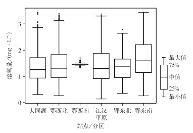 图 6 湖北省各分区与洪湖市大同湖农场溶氧量预测值箱线图 Fig. 6 Box plot of predicted dissolved oxygen in various districts of Hubei Province and in Datonghu Farm of Honghu City |