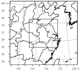 图 1 WRF-EnKF模式模拟区域设置 注:模式资料选用第二层嵌套d02数据。 Fig. 1 Simulation domain setting of the WRF-EnKF model |