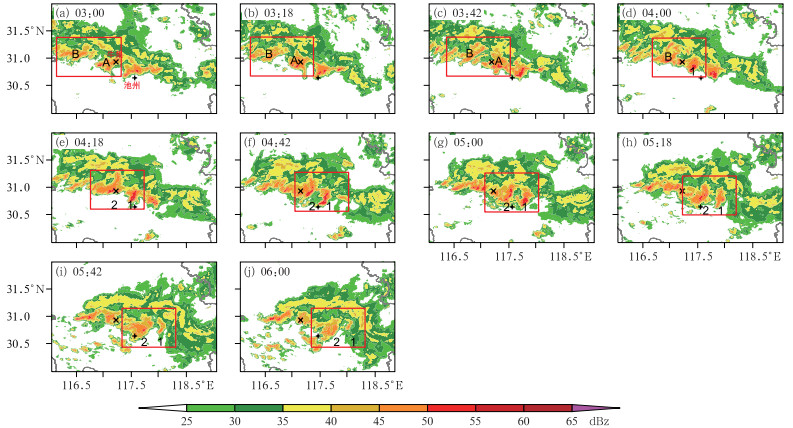 图 3 2023年5月27日实况组合反射率 注:红色方框为对流关键区,“×”代表牛集站位置,“+”代表池州站位置,A、B代表多单体风暴,1、2代表短对流,下同。 Fig. 3 Observed composite reflectivity on 27 May 2023 |