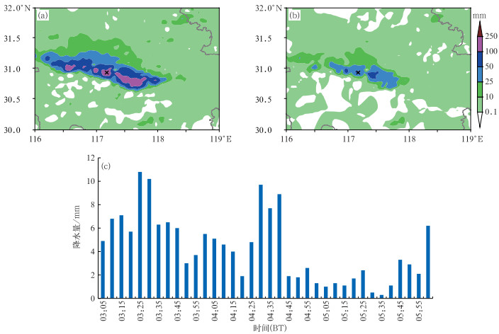 图 4 2023年5月27日(a)03:00—06:00、(b)04:00—05:00实况累计降水量,(c)03:00—06:00牛集站逐5 min降水量时序 Fig. 4 (a, b) Observed accumulated precipitation from (a) 03:00 BT to 06:00 BT and (b) 04:00 BT to 05:00 BT, (c) time series of 5 min precipitation at Niuji Station from 03:00 BT to 06:00 BT 27 May 2023 |