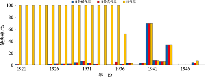 贵阳站建站以来的气象观测记录月报表完整,1921—1944年月报表中记录有日最高气温、日最低气温及二者均值(代替日气温)和气温日较差。1937年2月起有气象观测薄记录,记录内容包括:逐时气温、日最高气温和日最低气温。图 1是1921—1949年贵阳气象观测薄、月报表整合后的日气温数据缺失情况,日最低气温缺失率为5.2%,日最高气温缺失率为5.3%;日气温:1921—1936年,数据缺失率为100%,1937—1948年,数据缺失率为12.2%,1949年之后,数据完整。需要说明的是:1921—1953年,日最高气温、日最低气温是当日00—23时(北京时,下同)观测值;1954年1月至1960年7月、1960年8月至2023年12月,日最高气温、日最低气温分别是前日19时至当日19时、前日20时至当日20时出现的最高气温和最低气温;1937—1944年、1960年8月至2020年12月,日气温是当日02时、08时、14时、20时的4个时次气温正点观测值平均值;1954年1月至1960年7月,日气温是当日01时、07时、13时、19时的4个时次气温正点观测值平均值。