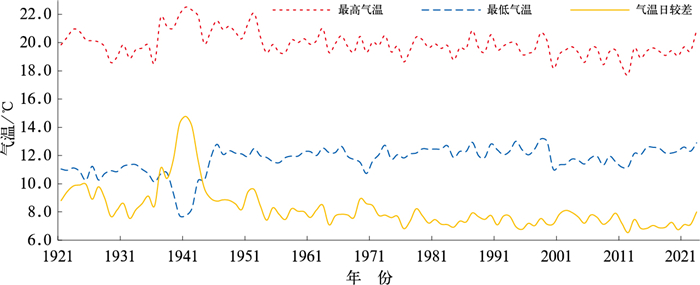 图 2 1921—2023年贵阳站气象观测月报表的最高气温、最低气温、气温日较差序列 Fig. 2 Sequences of maximum temperature, minimum temperature and diurnal temperature range from meteorological observation monthly reports at Guiyang Station from 1921 to 2023 |