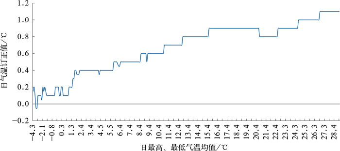 由于1921—1936年无日气温记录,只能用其日最高气温、最低气温通过式(1)构建日气温,用1938—1949年的相应数据作标尺订正两者误差(图 5),图中全量程订正均值与年订正值一致,同为0.7℃,订正值见表 3。