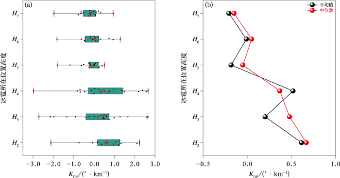 图 2 KDP(a)在各个高度的分布和(b)平均值、中位数随高度变化趋势 Fig. 2 (a) Distribution of KDP at different heights and (b) trend of KDP's mean and median values with altitude |