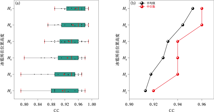 图 3 CC(a)在各个高度的分布和(b)平均值、中位数随高度变化趋势 Fig. 3 (a) Distribution of CC at different heights and (b) trend of CC's mean and median values with altitude |