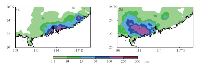 图 1 2023年9月(a)1日00时至2日00时,(b)2日00时至3日00时台风“苏拉”(2309号)24 h累计降水量 Fig. 1 The 24 h accumulated precipitation of Typhoon Saola (No.2309) from (a) 00:00 UTC 1 to 00:00 UTC 2 and (b) 00:00 UTC 2 to 00:00 UTC 3 September 2023 |