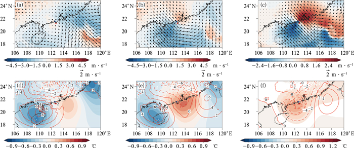 图 11 2023年9月2日(a~c)12时和(d~f)18时850 hPa水汽通量(矢量和填色,单位:kg·m-1·hPa-1·s-1)及水汽通量散度(红色等值线,单位:10-5 kg·m-2·hPa-1·s-1) (a, d)CTL,(b, e)BDS,(c, f)BDS和CTL之差 Fig. 11 The 850 hPa water vapor flux (vector and colored, unit: kg·m-1·hPa-1·s-1) and water vapor flux divergence (red contour, unit: 10-5 kg·m-2·hPa-1·s-1) of (a, d) CTL, (b, e) BDS and (c, f) difference between BDS and CTL at (a-c) 12:00 UTC 2 and (d-f) 18:00 UTC 2 September 2023 |
