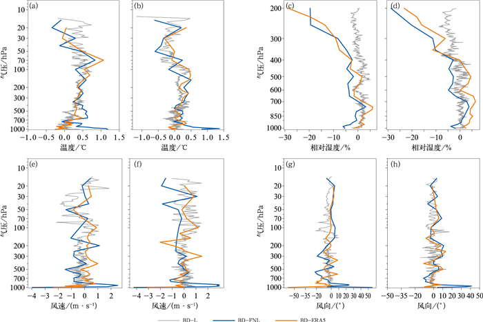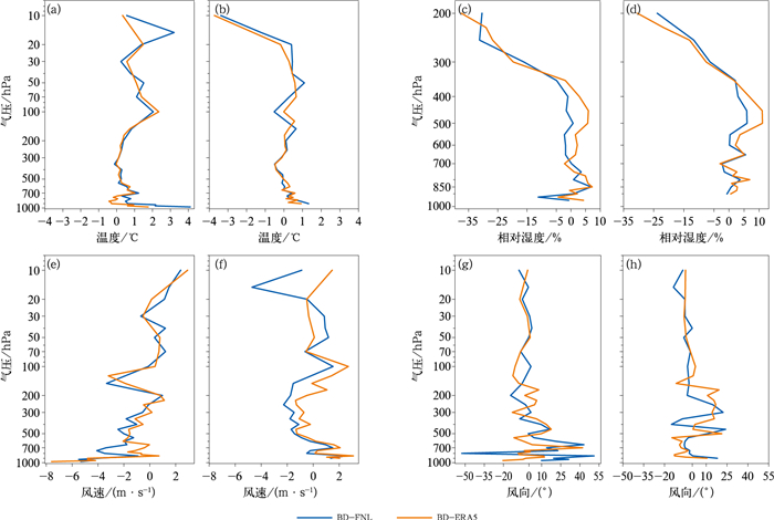 图 4 2023年8月31日00时至9月6日00时(a, c, e, g)00时和(b, d, f, h)12时北斗探空下降段与FNL分析场和ERA5再分析资料的(a, b)温度,(c, d)相对湿度,(e, f)风速,(g, h)风向平均偏差 Fig. 4 The average deviations of (a, b) temperature, (c, d) relative humidity, (e, f) wind speed, and (g, h) wind direction from FNL analysis field and ERA5 reanalysis data during the descending segment of Beidou sounding at (a, c, e, g) 00:00 UTC and (b, d, f, h) 12:00 UTC from 00:00 UTC 31 August to 00:00 UTC 6 September 2023 |