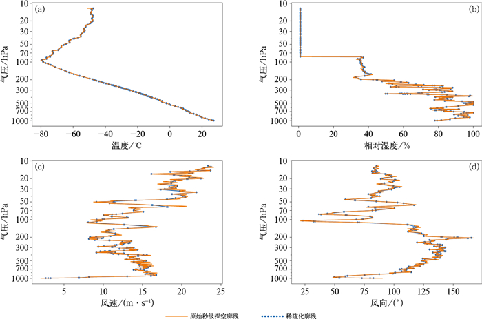 由于各气象要素在不同的探空高度变化规律差异较大,气象要素的稀疏化选取阈值也需要随高度而变化,本文以200 hPa作为分界线,将对流层分为上层和下层。以2023年9月2日00时河源站上升段廓线为例,上层温度阈值取为0.8℃,相对湿度阈值为5%,风速阈值为10 m·s-1,风向阈值为10°;下层温度阈值为0.6℃,相对湿度阈值为2%,风速阈值为4 m·s-1,风向阈值为4°;得到特性层311层。稀疏化廓线能够用相对较少的数据量最大程度地反映原始秒级数据中要素廓线随高度的变化特征(图 5),但各气象要素阈值的设定仍需考虑数值预报模式的垂直层数,及其对秒级探空资料的同化应用能力。