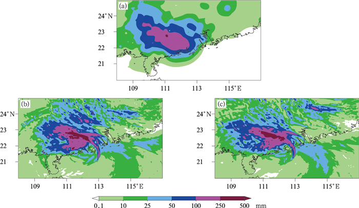 图 8 2023年9月2日00时至3日00时台风“苏拉”(a)观测,以及(b)CTL和(c)BDS预报的24 h累计降水量 Fig. 8 The 24 h accumulated precipitation of Typhoon Saola (a) observed, and (b, c) forecasted by (b) CTL and (c) BDS from 00:00 UTC 2 to 00:00 UTC 3 September 2023 |