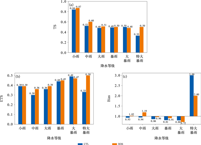 将24 h累计降水量(单位:mm)划分为六个等级,分别为小雨[0.1, 10)、中雨[10, 25)、大雨[25, 50)、暴雨[50, 100)、大暴雨[100, 250)和特大暴雨[250, +∞)。由TS和ETS评分可见(图 9a,9b),除大暴雨量级BDS评分略低于CTL外,其余量级降水评分BDS高于CTL,说明同化北斗探空对降水预报具有改善作用。另外,BDS特大暴雨评分显著高于CTL,这一结果进一步印证了同化北斗探空在提升降水预报技巧方面的显著成效。Bias评分(图 9c)显示,小雨、大雨和暴雨量级降水,BDS均更接近1,较好地改善了CTL的漏报问题,但中雨量级BDS的空报和大暴雨量级的漏报均略有增加。在特大暴雨量级,CTL评分为3,存在较多的空报,而BDS在一定程度上改善了空报问题。总体来看,BDS的24 h累计降水落区及强度较CTL更为接近实况,整体降水预报效果更优,降水评分更高,尤其是对特大暴雨预报技巧的提升更为明显。