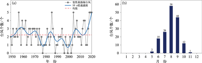 2 结果分析 2.1 台风活动年频数1949—2020年,共有311个台风进入黄渤海区域,年均4.3个(图 2a)。黄渤海台风频数具有明显的年际和年代际变化特征:10 a低通滤波曲线显示20世纪50年代末到70年代中期、90年代后期到21世纪00年代中期和2012年后为黄渤海台风相对偏多时段,其余则偏少或与气候态持平。2018年为72年中黄渤海台风最多年份,有10个台风进入黄渤海区域;1958年、1963年、1980年和1983年则最少,仅有1个。序列的线性回归斜率为0.16个·(10 a)-1,即黄渤海台风年频数存在不显著的上升趋势(P>0.1)。