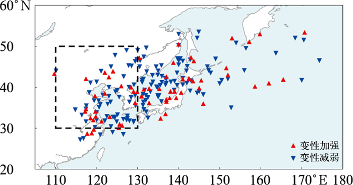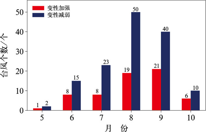 台风变性是热带系统与中纬度环流系统相互作用的一个特殊阶段。当台风在变性过程中从斜压区获得能量时,有可能再度加强,使暴雨突然增幅(李英等,2013;丁一汇和陈联寿,1979)。《台风年鉴》记录的台风完成变性后,当后一时次与前一时次之间的中心气压差为负(正)时,记为该台风发生1次变性加强(减弱)过程,连续时次之间气压差符号一致记为同一次(若变性台风仅有1个时次记录则不计入分析)。