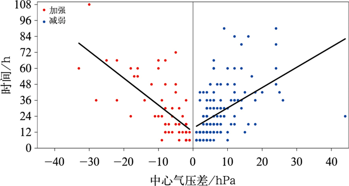 图 13 1949—2020年黄渤海台风变性加强、减弱时中心气压随时间的变化 注:黑线为两类散点的线性回归。 Fig. 13 Temporal variation of central pressure of intensifying and weakening after extratropical transition of HBS TCs during 1949-2020 |
