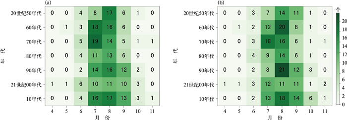 黄渤海台风月际活动存在年代际变化。此处按年代划分,分析20世纪50年代以来黄渤海台风在各月的生成频数,以及台风在各月进入黄渤海区域的频数(图 5)。结果显示:(1)黄渤海台风生成、台风进入黄渤海区域的时段均集中在7—8月前后;(2)20世纪50—80年代,7—8月生成的黄渤海台风占全年黄渤海台风总数的69.4%~77.3%,但这一比例在90年代后下降至50.0%~65.2%,同时9—10月生成的黄渤海台风占比从13.3%~19.4%上升至29.6%~31.0%;(3)类似地,90年代前7—8月进入黄渤海区域的台风占全年黄渤海台风总数的58.3%~75.6%,但在90年代后下降至54.8%~63.0%,同时9—10月进入黄渤海区域的台风占比从15.6%~33.3%上升至28.6%~37.0%。该结果表明从20世纪90年代开始,伴随着黄渤海台风在西太台风中的占比快速增加,黄渤海台风的活跃时段也出现了向“秋季扩展”的趋势。