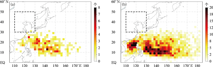 图 6 1949—2020年(a)黄渤海台风和(b)西太台风在逐2°×2°区域的生成个数 注:虚线框所示区域为黄渤海区域,下同。 Fig. 6 The number of (a) HBS TCs and (b) WNP TCs generated within 2°×2° grid areas during 1949-2020 |