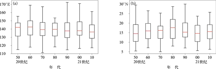 图 7 1950—2019年黄渤海台风生成源地(a)经向和(b)纬向分布年代际变化箱须图 注:上、下两条须横线分别为最大和最小值,箱体上、下两条横线分别为第75%和25%分位值,红线为中位数。 Fig. 7 The boxplot of the interdecadal (a) meridional and (b) latitudinal distributions of HBS TCs' genesis location during 1950-2019 |