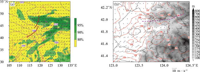 2.2 天气形势和环境条件8月4日19:00,500 hPa(图 2a),东北地区存在阶梯槽,辽宁位于位置偏南、较浅的高空槽的底部;副热带高压(以下简称副高)588 dagpm线已经北上到辽宁南部,584 dagpm线位于辽宁中部地区,抚顺地区恰好位于584 dagpm线的北边界。浅槽和副高向东略偏南的方向缓慢移动,在两个天气尺度系统之间形成位势梯度大值区。850 hPa的低空涡旋中心位于黑龙江南侧(图 2a),其底部的切变线在4日夜间呈西南—东北走向,影响辽宁地区,并向东略偏南的方向缓慢南下, 辽宁东部存在相对湿度大于80%的湿区。另外,地面实况资料显示(图 2b),在沈阳至抚顺一带存在东西走向、较为平直的辐合线,该辐合线由来自辽河流域的暖空气和北部冷空气交汇而成,在其上空可触发降水系统。