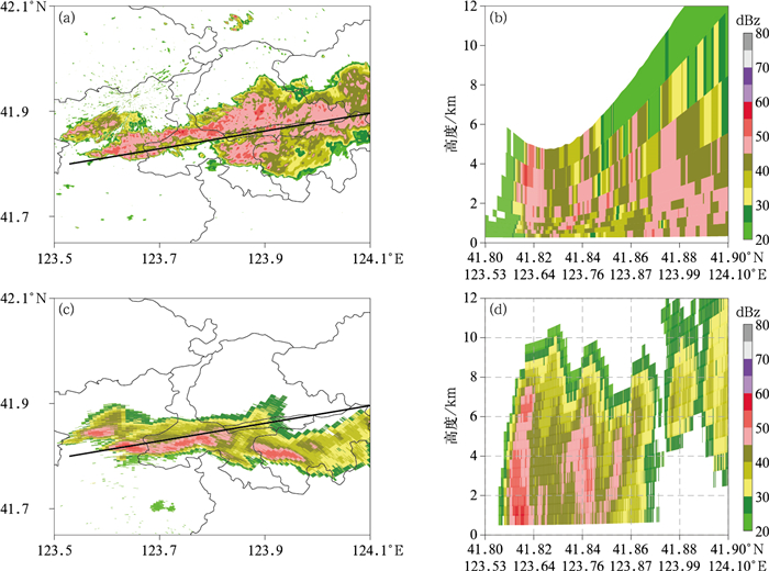 图 4 2023年8月4日21:00沈阳(a,b)SC雷达和(c,d)X波段相控阵雷达的0.5°仰角(a,c)反射率因子和(b,d)反射率因子垂直剖面 注:图b,d为分别沿图a,c中黑色直线的剖面。 Fig. 4 (a, c) Radar reflectivity factor at 0.5° elevation and (b, d) vertical cross-section of radar reflectivity factor observed by (a, b) SC radar and (c, d) X-band phased array radar at Shenyang at 21:00 BT 4 August 2023 |