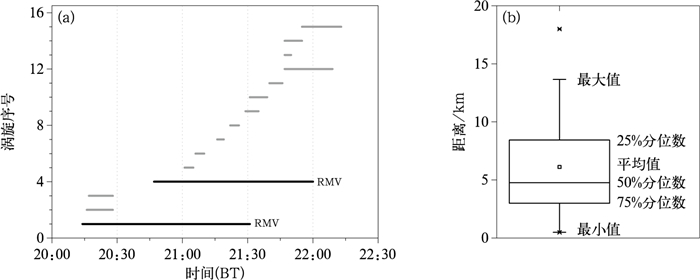 所有MV活动区域均位于沈阳至抚顺这一狭窄的条状区域(图 5a),普遍自西向东移动,与近地面影响系统和风暴的移动方向一致。所有MV集中出现在20:14—22:15(图 6a),平均持续时间只有17 min,普遍没有达到中气旋的标准(18 min)(Yu et al,2012)。另外,MV平均厚度在1.7 km,平均顶高3.5 km,即为浅薄的低空MV。综上,本次过程中的多个MV是位于准线状对流系统内、维持时间普遍不足1 h、处于大气低层的MV,以上特征和超级单体风暴中气旋存在不同(Browning,1964;Moller et al,1994;俞小鼎等,2008;Kumjian and Ryzhkov, 2012)。