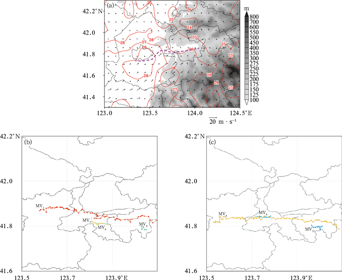 图 8 2023年8月4日(a)21:00地面气温(等值线,单位:℃)、风场(风矢)和海拔高度(阴影), (b)MV1、(c)MV4及其附近MV的移动路径(彩色点线) 注:图a紫色虚线为地面辐合线。 Fig. 8 (a) The surface temperature (contour, unit: ℃), wind (wind vector) at 21:00 BT and altitude (shaded), and (b, c) the movement paths of (b) MV1, (c) MV4 and nearby MVs (colored dot line) on 4 August 2023 |