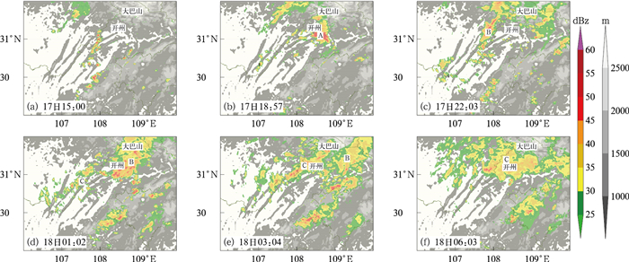 图 4 2021年6月17—18日万州雷达组合反射率因子(彩色填色) 注:A、B、C为中尺度对流系统,灰度填色为地形。 Fig. 4 Composite reflectivity factor (colored) of Wanzhou Radar from 17 to 18 June 2021 |