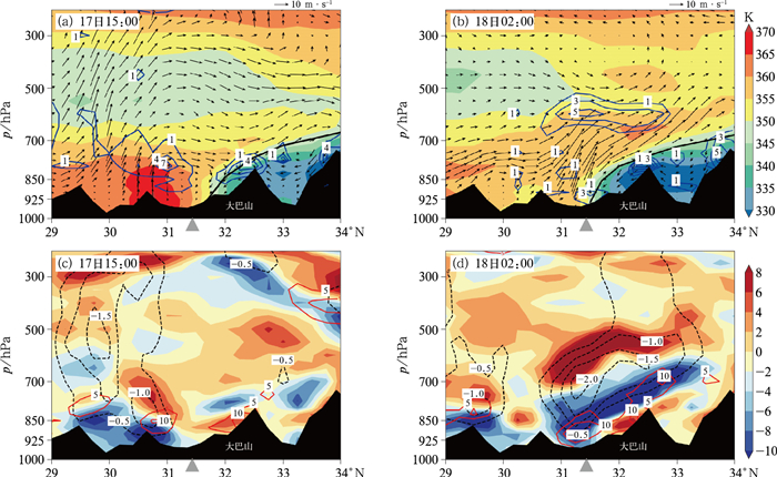 图 8a和8b为2021年6月17—18日沿108°E假相当位温、锋生函数和垂直环流剖面。可以看出,受大巴山地形阻挡,冷空气主体很难直接翻越大巴山脉,大尺度锋区在此停滞,前沿位于31.5°N附近,同时有大量水汽和不稳定能量在山前聚集。17日15:00(图 8a)对流初生时,大尺度冷锋前为高温高湿区,近地面到700 hPa都为假相当位温大值区,中心值超过365 K,而600~400 hPa则为假相当位温冷中心,形成上干冷下暖湿的不稳定层结,有强的对流不稳定。同时850~700 hPa伴有较强的锋生,中心值为7×10-9 s-1,垂直上升气流在30°N附近强烈发展。18日02:00(图 8b)降水强盛时,上升气流区北移到大巴山南麓31°N附近,暖湿气流沿着大巴山和锋面倾斜爬升,与秦岭和大巴山区的下沉气流构成锋面垂直环流圈。同时大巴山南麓有边界层锋生发展,中层锋生叠加在边界层锋生之上,利于对流系统在此增强和维持。结合图 8c和8d涡度、散度和垂直速度剖面图可以看出,大巴山迎风坡地形对涡度增长和垂直运动增强有重要作用。17日15:00(图 8c),辐合区和上升运动区距大巴山还有1个纬度左右的距离,但低层偏南风与大巴山垂直,地形强迫抬升作用造成大巴山迎风坡靠近山顶处有正涡度生成,中心值为10×10-5 s-1。18日02:00(图 8d)偏南急流增强,地形强迫抬升作用也进一步增强,正涡度区沿着大巴山倾斜发展,中心值达15× 10-9 s-1。同时低层辐合也沿着地形和锋面倾斜向北发展,700~500 hPa中层辐散较强,中心值超过8×10-9 s-1,这种低层辐合、中高层辐散的配置,有利于垂直方向上大气抽吸作用增强,大巴山南麓上升运动强烈发展,向上伸展至300 hPa。因此,锋面抬升和大巴山地形的共同作用,为中尺度对流系统在大巴山南麓停滞并增强提供了有利的热力和动力条件。