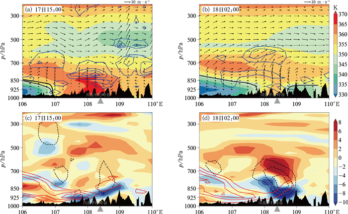 图 8 2021年6月17—18日沿108°E的(a,b)u-10ω合成风场(风矢,单位:m·s-1)、假相当位温(填色)和锋生函数(等值线,单位:10-9 s-1),(c,d)涡度(红色等值线,单位:10-5 s-1)、散度(填色,单位:10-5 s-1)和垂直速度(黑色等值线,单位:Pa·s-1)的垂直剖面 注:黑色阴影为地形,灰色三角形代表开州;图a、b中黑色实线代表锋面。 Fig. 8 The vertical cross-section of (a, b) the u-10ω composite wind field (wind vector, unit: m·s-1), pseudo-equivalent potential temperature (colored), and frontogenesis function (contour, unit: 10-9 s-1), and (c, d) the vorticity (red contour, unit: 10-5 s-1), divergence (colored, unit: 10-5 s-1) and vertical velocity (black contour, unit: Pa·s-1) along 108°E from 17 to 18 June 2021 |