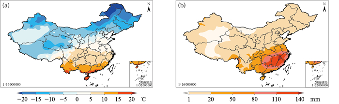 图 1 1991—2020年中国春节假期(a)平均气温和(b)降水量的平均值空间分布 Fig. 1 Spatial distribution of (a) air temperature and (b) precipitation during the Spring Festival holiday averaged over 1991-2020 in China |