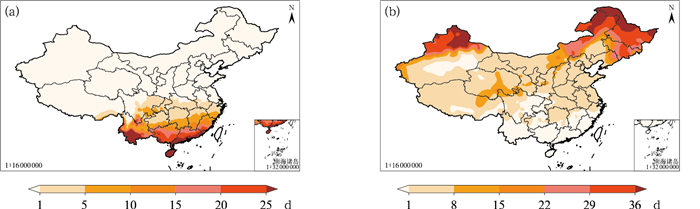 图 7 1961—2023年春节假期(a)冷空气过程频次和(b)日数的历年变化 Fig. 7 Annual variation of (a) frequency and (b) days of cold air processes during the Spring Festival holiday from 1961 to 2023 |