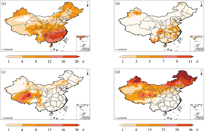 图 3 1991—2020年中国春节假期(a)降水日数,(b)雾日数,(c)大风日数和(d)寒冷日数的平均值空间分布 Fig. 3 Spatial distribution of (a) rainy days, (b) foggy days, (c) windy days and (d) cold days during the Spring Festival holiday averaged over 1991-2020 in China |