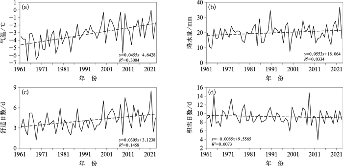 图 5 1961—2023年春节假期全国平均(a)气温, (b)降水量, (c)舒适日数和(d)积雪日数的历年变化 Fig. 5 Annual variation of national-averaged (a) temperature, (b) precipitation, (c) comfortable days and (d) snow cover days during the Spring Festival holiday from 1961 to 2023 |