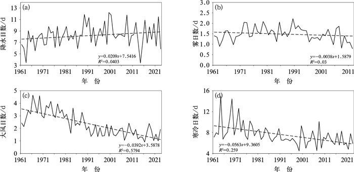 图 6 1961年以来春节假期全国平均(a)降水日数, (b)雾日数, (c)大风日数和(d)寒冷日数的历年变化 Fig. 6 Annual variation of national-averaged (a) rainy days, (b) foggy days, (c) windy days, and (d) cold days during the Spring Festival holiday since 1961 |