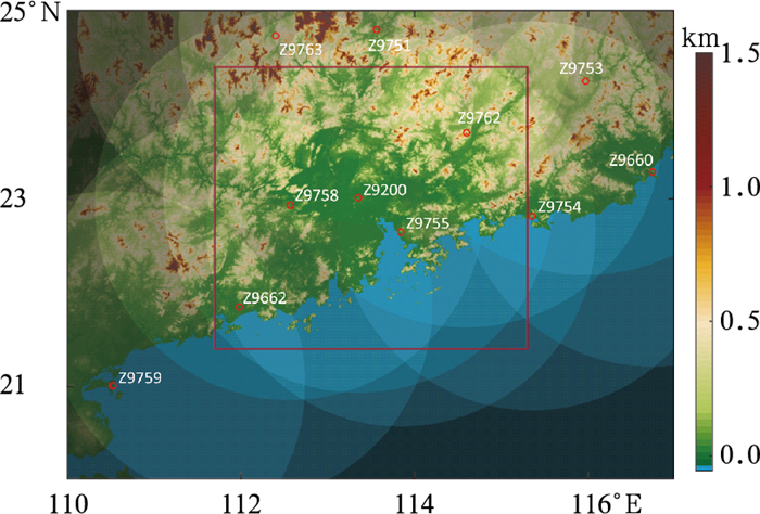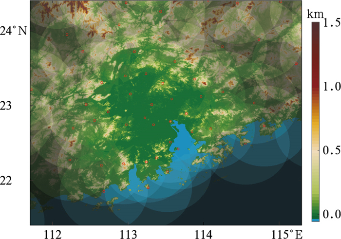 图 1 广东省X-PAR密集组网区雷达分布与地形高程图 注:红色圆圈为雷达位置,明暗表示雷达观测覆盖情况。 Fig. 1 The distribution of the X-PAR dense network zone in Guangdong Province and digital elevation model (DEM) |