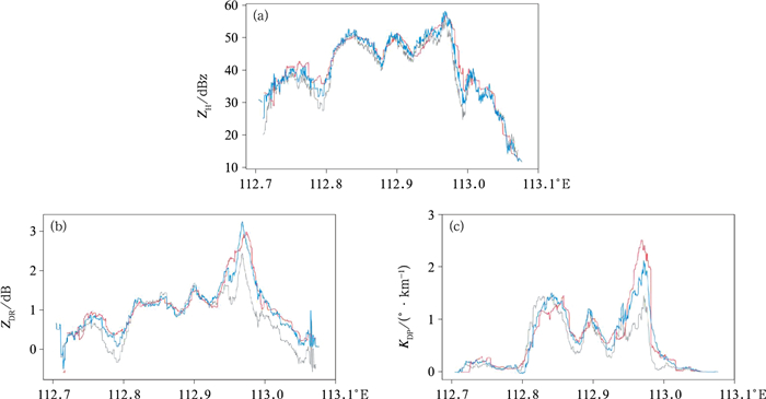 图 12 图 11 RHI剖面中2022年5月11日07:12广东省一次对流天气2 km高度层(a)ZH, (b)ZDR, (c)KDP的拼图结果 注:灰色曲线为X-PAR拼图(转化为S波段),红色曲线为S-POL拼图,蓝色曲线为拼图融合结果。 Fig. 12 The mosaic results of (a) ZH, (b) ZDR and (c) KDP at 2 km altitude for a severe convective weather system in Guangdong Province at 07:12 UTC 11 May 2022 in the RHI shown in Fig. 11 |