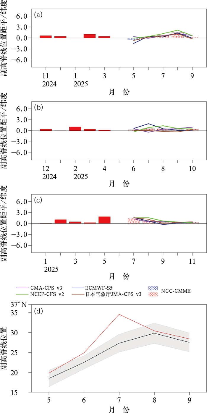 2024年前冬至11月,热带印度洋海温异常偏高,全区一致海温模态(IOBM)距平指数维持在0.7℃以上,12月之后明显减弱,12月至2025年2月维持在0.2~0.4℃(图 9c),说明印度洋海温对这次La Niña状态表现出一定程度的响应。此外,NCC-CMME预测2025年春、夏季热带印度洋海温偏高,IOBM距平指数维持在0.3~0.5℃(图 9c)。研究表明,年际尺度上,春季印度洋海温偏高对东亚大气环流有显著的滞后影响,有利于7—10月副高偏北、东亚夏季风偏强(Zhao et al, 2019),即2025年印度洋春、夏季的海温偏高也有利于华北和东北等地盛夏降水偏多。