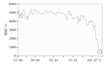 图 1 MOR雷达站(红圈)与成都地区雷达站(绿圈)之间的地形垂直剖面 Fig. 1 Vertical profile of terrain gradient between the two radar stations in MOR (red circle) and Chengdu (green circle) |