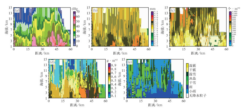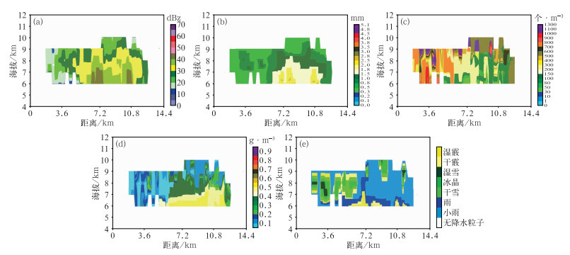图 11 2022年6月26日21:12 MOR X波段雷达在162°方位角观测的对流云降水成熟阶段的RHI (a)反射率因子,(b)雨滴等效直径,(c)雨滴数浓度,(d)云中液水含量,(e)降水粒子相态 Fig. 11 RHI of the convective cloud precipitation in the mature stage observed by the X-band radar at 162° azimuth in MOR at 21:12 BT 26 June 2022 (a) reflectivity factor, (b) raindrop equivalent diameter, (c) raindrop number concentration, (d) liquid water content in clouds, (e) precipitation particle phase |
