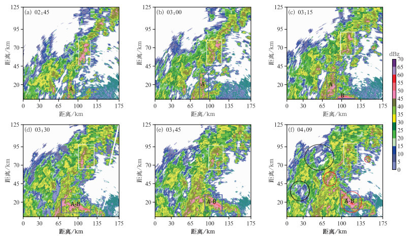 图 12 2023年7月13日02:45—04:09成都地区S波段雷达在1.5°仰角下观测的强对流强降水ZH 注:蓝框和白框表示各种强对流单体,红圈(黑圈)表示极大值区(极小值区),标记A-B表示飑线位置。 Fig. 12 Reflectivity factor of the severe convective precipitation observed at 1.5° elevation of the S-band radar in Chengdu from 02:45 BT to 04:09 BT 13 July 2023 |