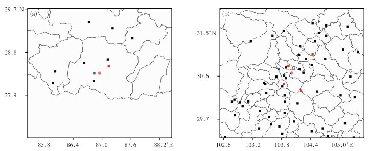 图 2 (a) MOR和(b)成都地区双偏振天气雷达站及其周边各类观测设备布设示意图 注:红色圆点为雷达站,蓝色方块为微波辐射计,红色方块为激光雨滴谱仪,黑色方块为地面雨量计。 Fig. 2 Layout diagram for dual-polarization radar stations and various observation equipments in their surroundings in (a) MOR and (b) Chengdu |