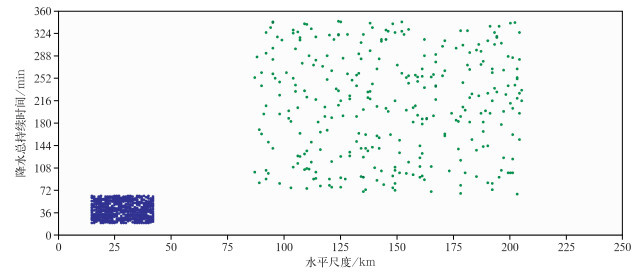 图 4 2019—2024年MOR(蓝色)和成都地区(绿色)夏季对流云降水在成熟阶段的水平尺度和降水总持续时间分布 Fig. 4 Distribution of horizontal scale and total precipitation duration of convective cloud precipitation in the mature stage in summer in MOR (blue) and Chengdu (green) from 2019 to 2024 |