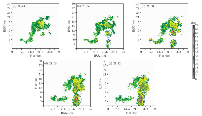 图 9是2022年6月26日20:48—21:12 MOR X波段雷达在5°仰角下观测的由深对流系统引发的一次对流云降水的平面位置扫描图。图中对流单体经历了新生、发展和合并增强三个阶段,总持续时间约25 min,其南北跨度约18 km,东西跨度约21 km。MOR地区对流云降水水平尺度小,持续时间短的这种特征与图 4中统计结果是一致的。